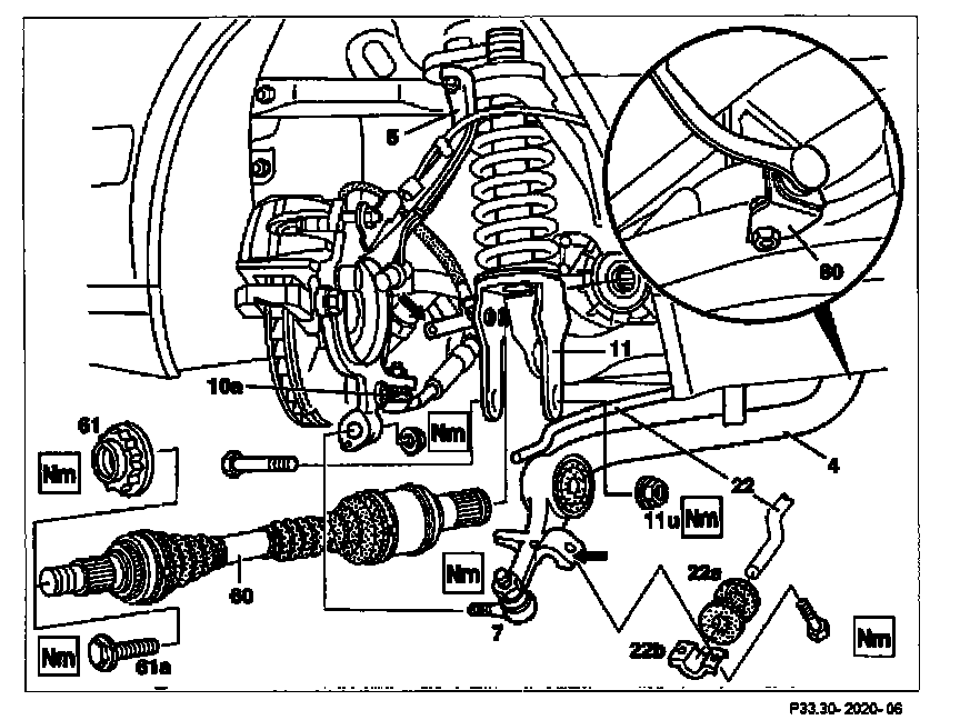 2. On second version detach hexagon collared bolt (61a) from front axle shaft