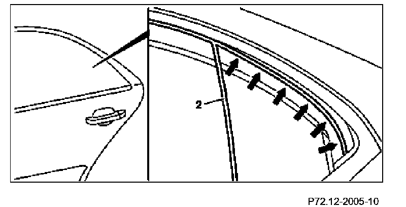 7. Glue on inner section of seal (2) with rubber channel adhesive (arrows).