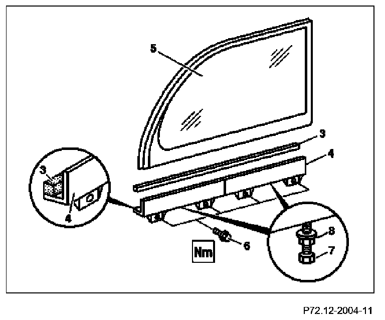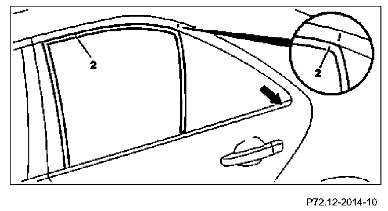 11. Insert window (5) into door frame toward B-pillar and slide completely upward.