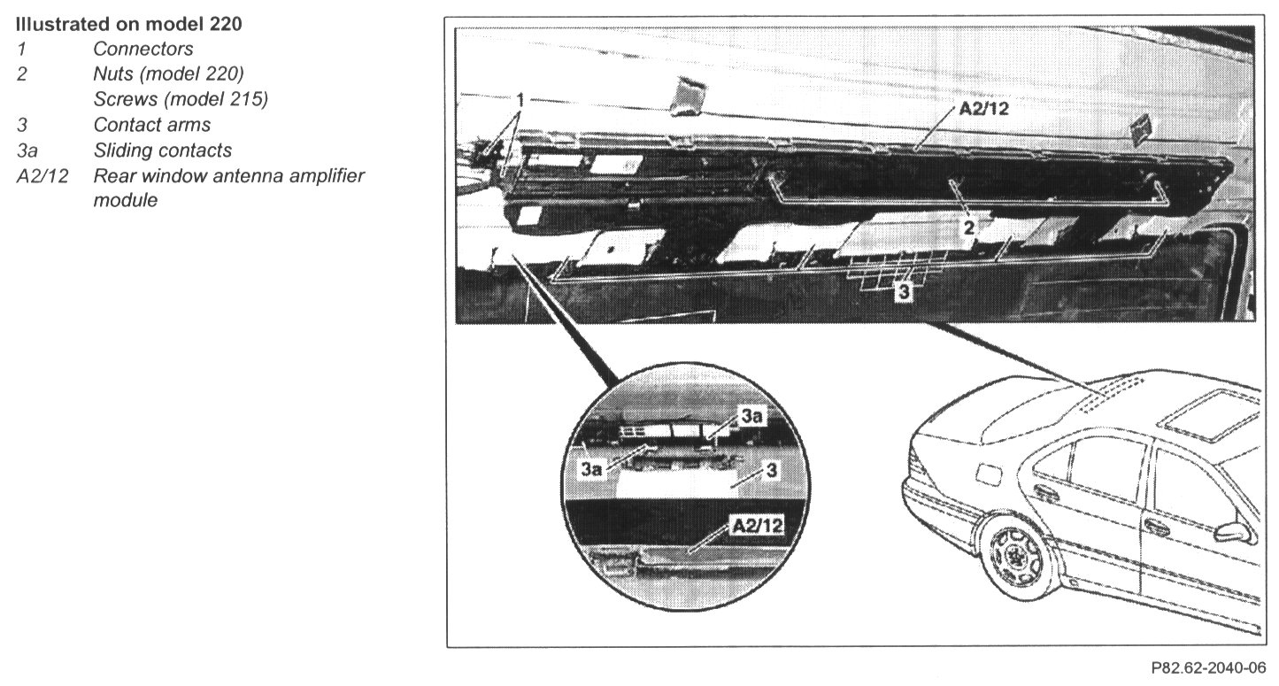 6 Lower rear window antenna amplifier module (A2/12) slightly and slide out of guides in direction of trunk together with contact arms (3)