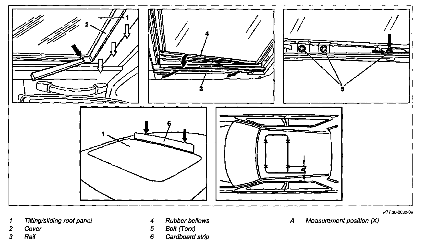 6 Detach rubber bellows (4) from tilting/sliding roof panel (1) to gain access to the torx bolts (5)
