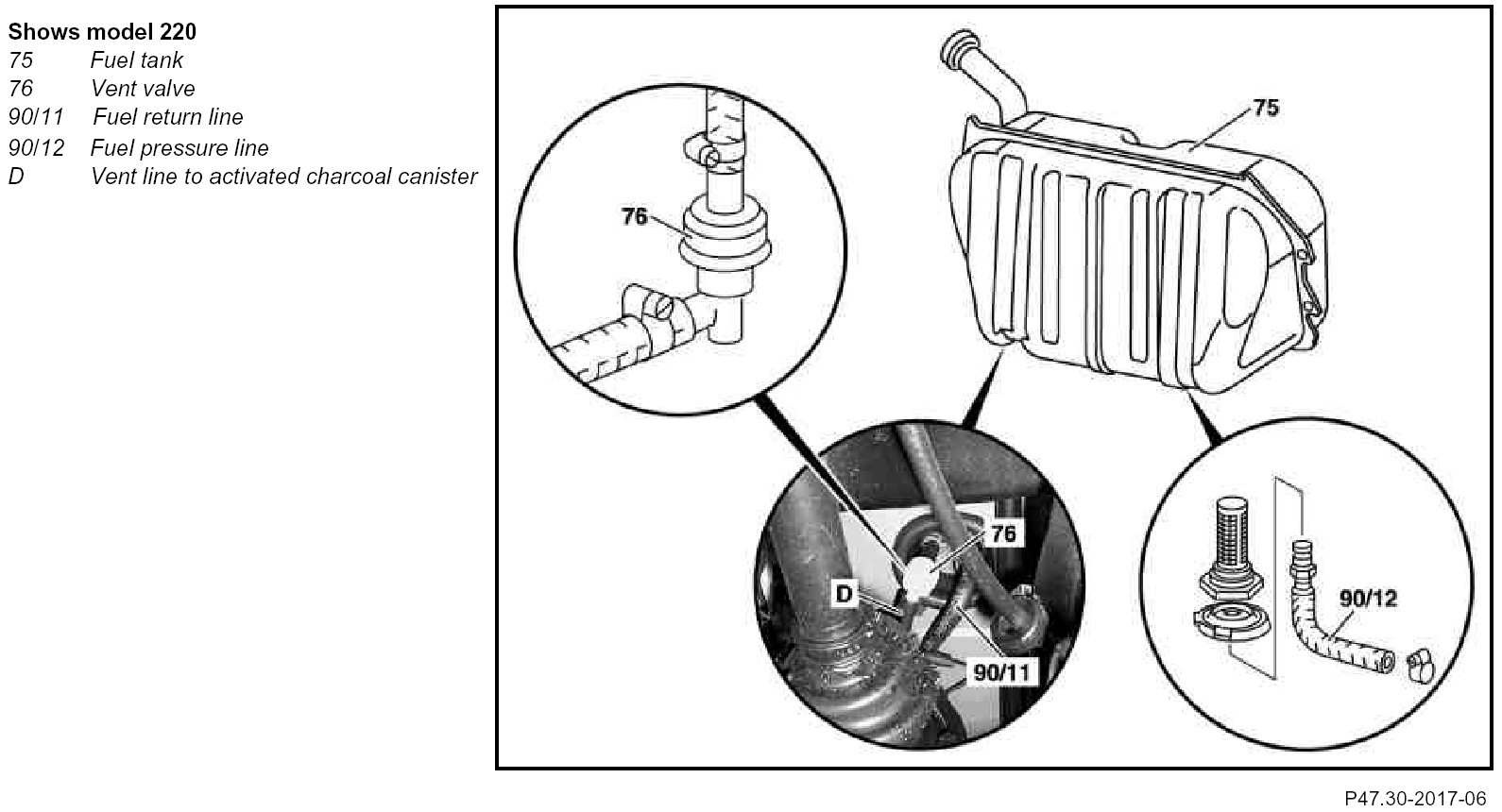 The vent valve (76) is mounted under the fuel tank in the vent line.