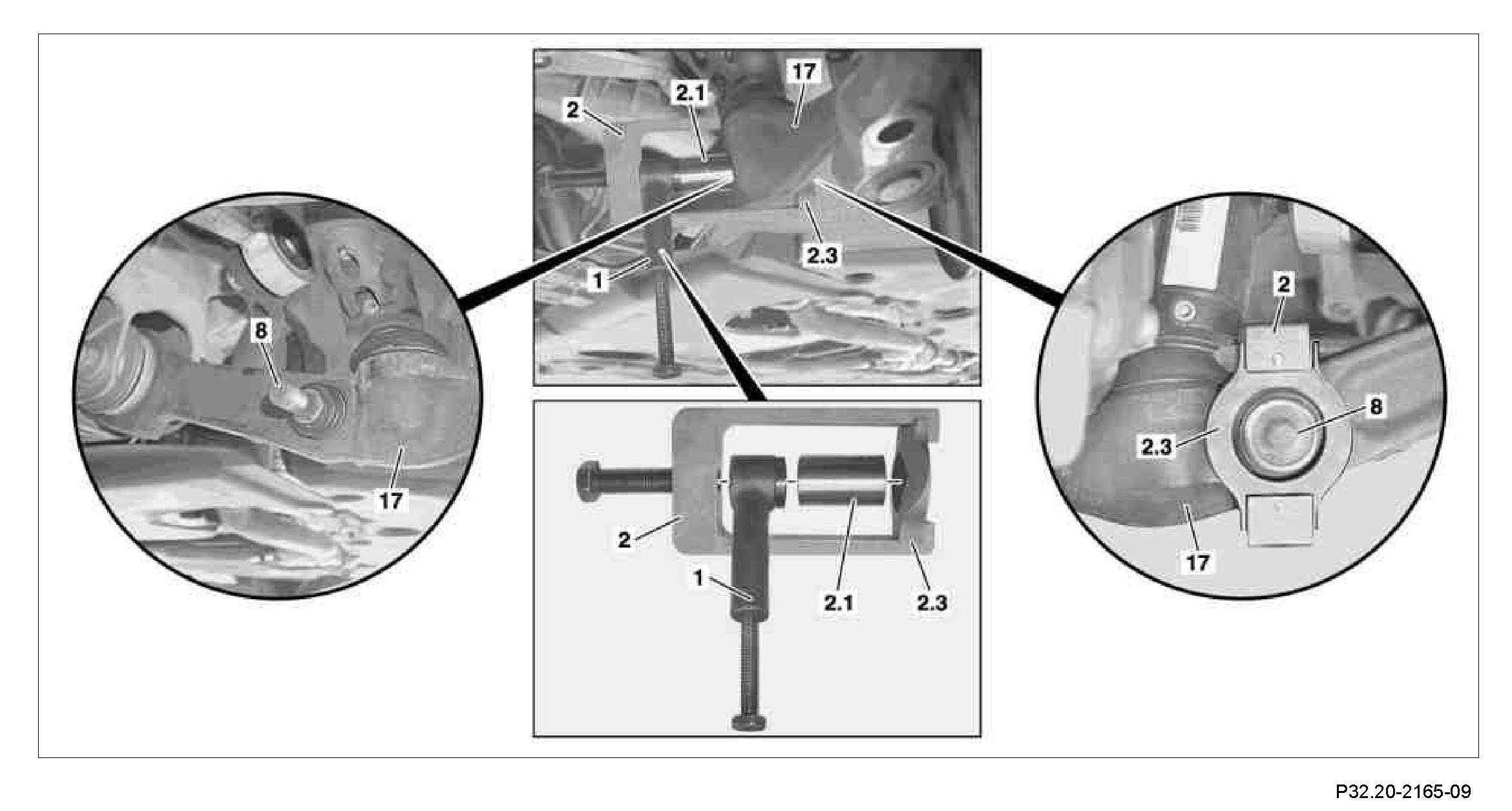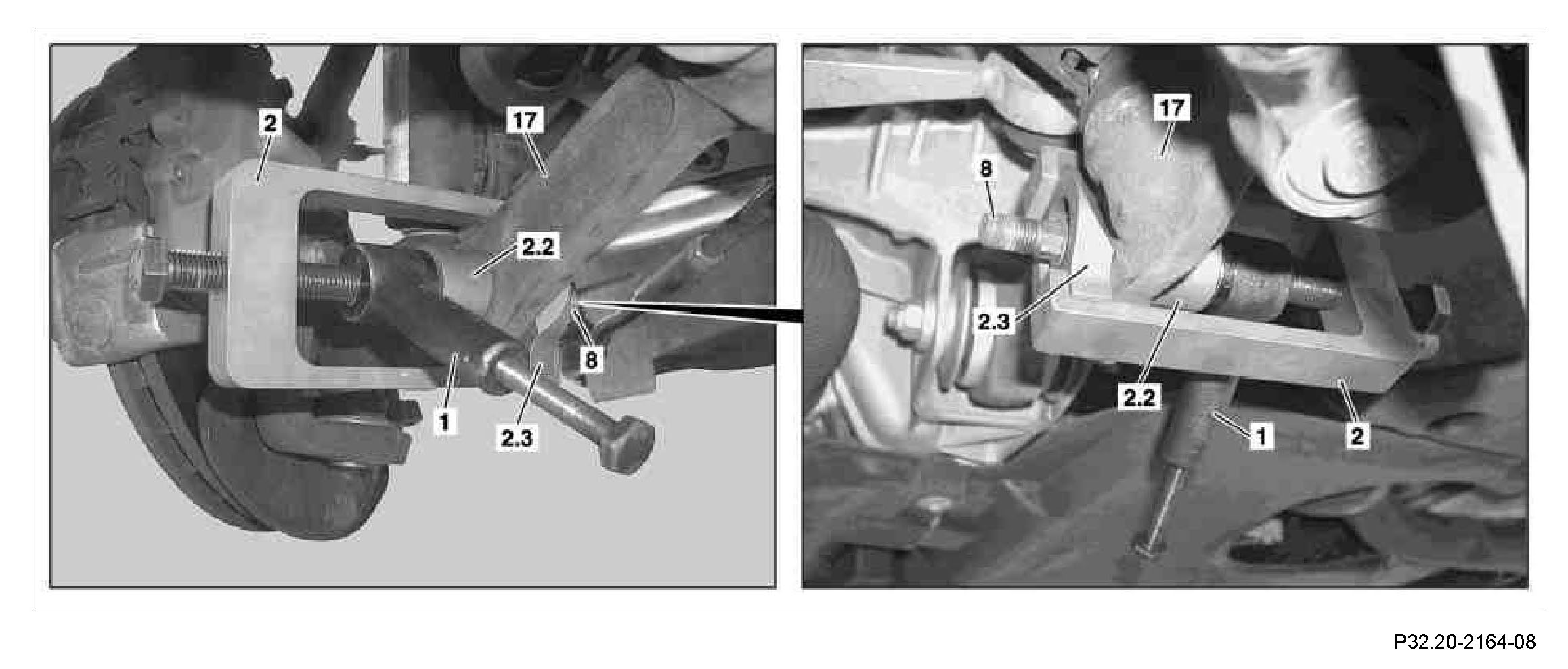 1 Press out stabilizer bar pivot bushing (8) with puller (2), press (1), press-out sleeve (2.1) and counterholder (2.3) from the spring control arm (17) opposite to the direction of travel.