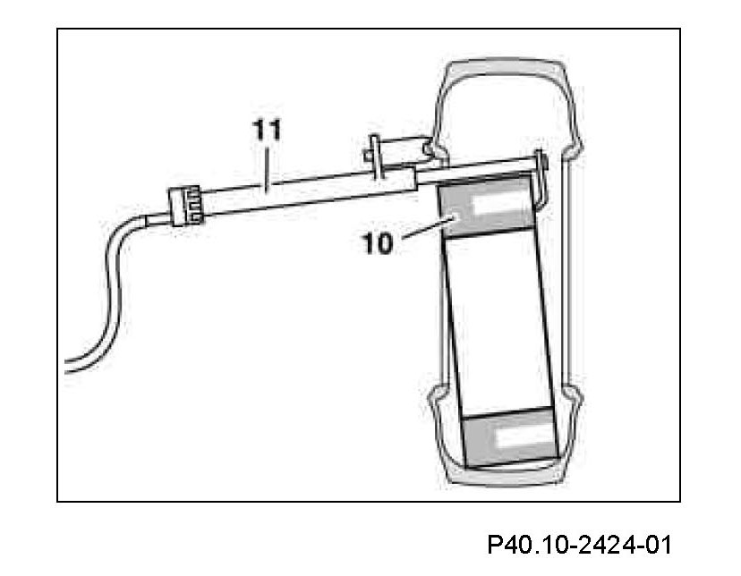 Extend the hook on the clamp cylinder (11) and position on the support ring (10) as shown in the diagram. Support the clamp cylinder (11) against the tire bead.