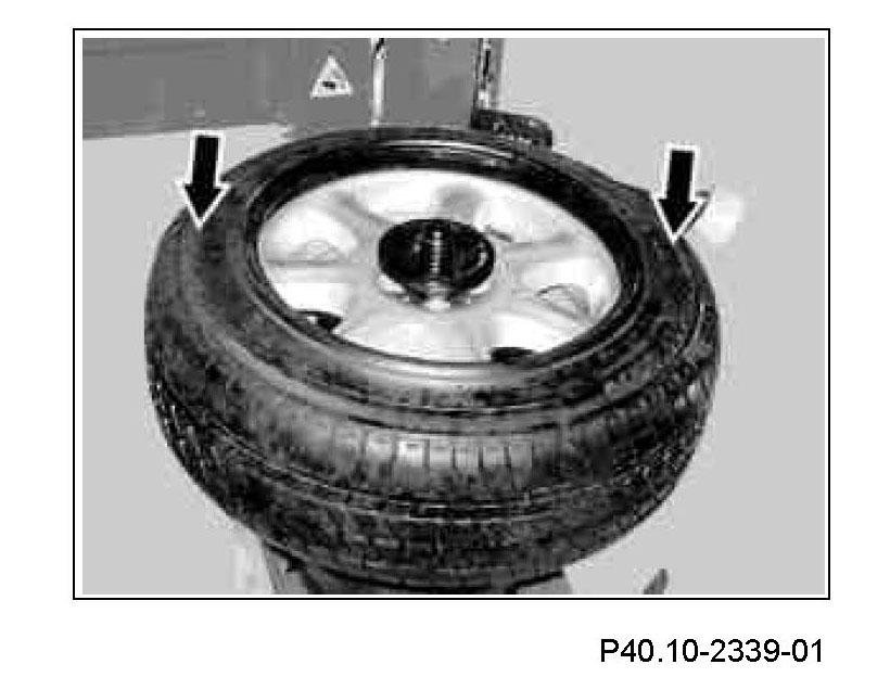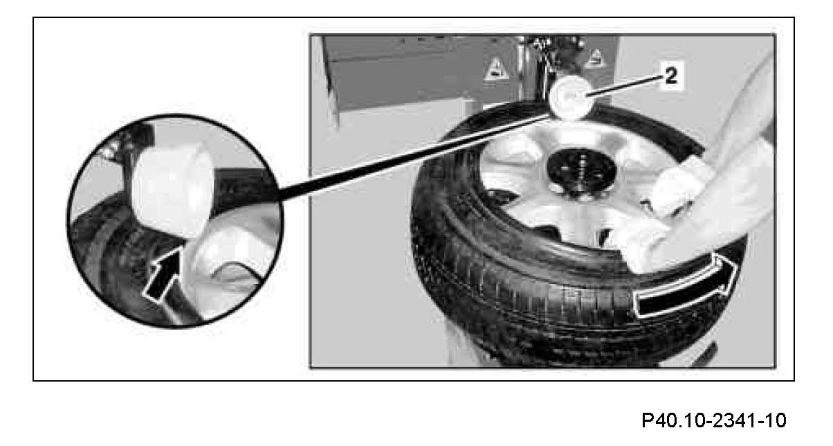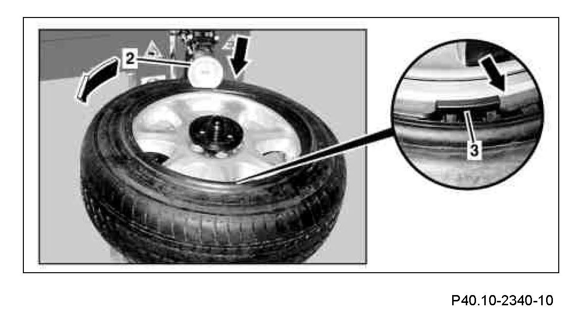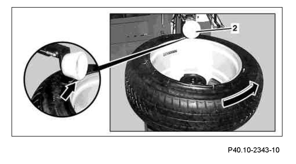 12 Place the roller (2) on the tire bead and rotate the wheel through approx. 2 additional turns.