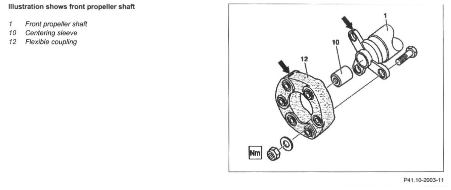 2 Label front and rear propeller shaft (12) in relation to three or four-arm flange (arrows) and remove