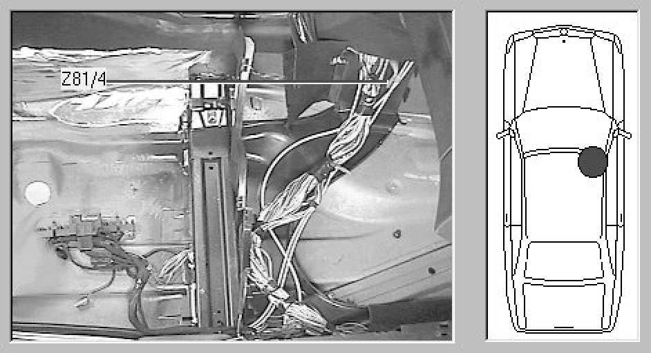 Left side of passenger's footwell, in wiring tray near center console