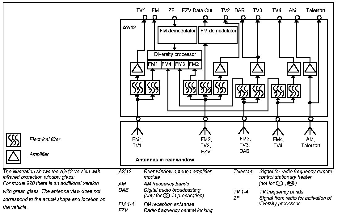 On model 220 the rear window antenna amplifier module (A2/12) version also depends on the rear window glass (infrared protection or green glass).