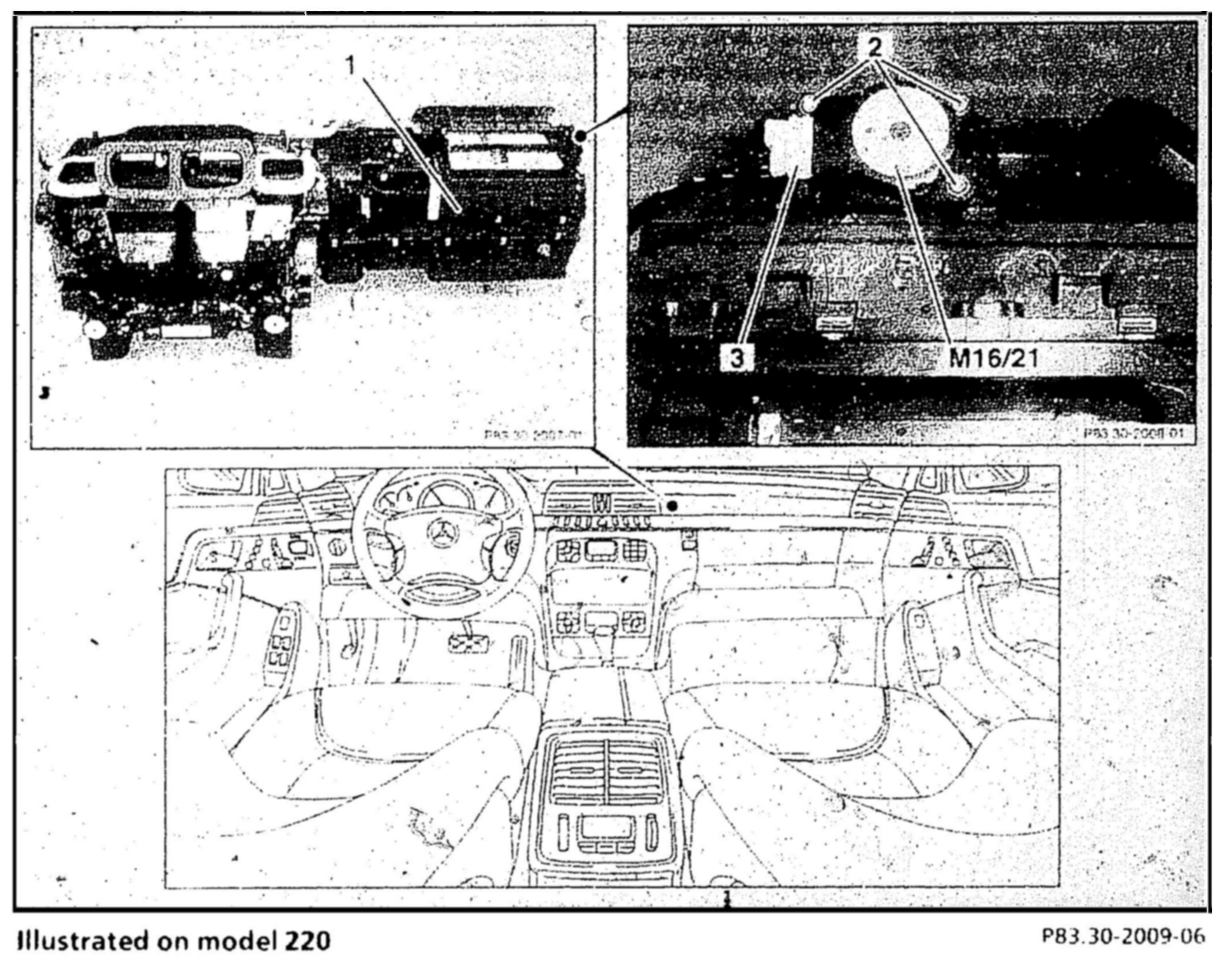 The fresh air/recirculated air flap actuator motor (M16/21) is located on the right side of the A/C housing between the fresh air and recirculated air flap.