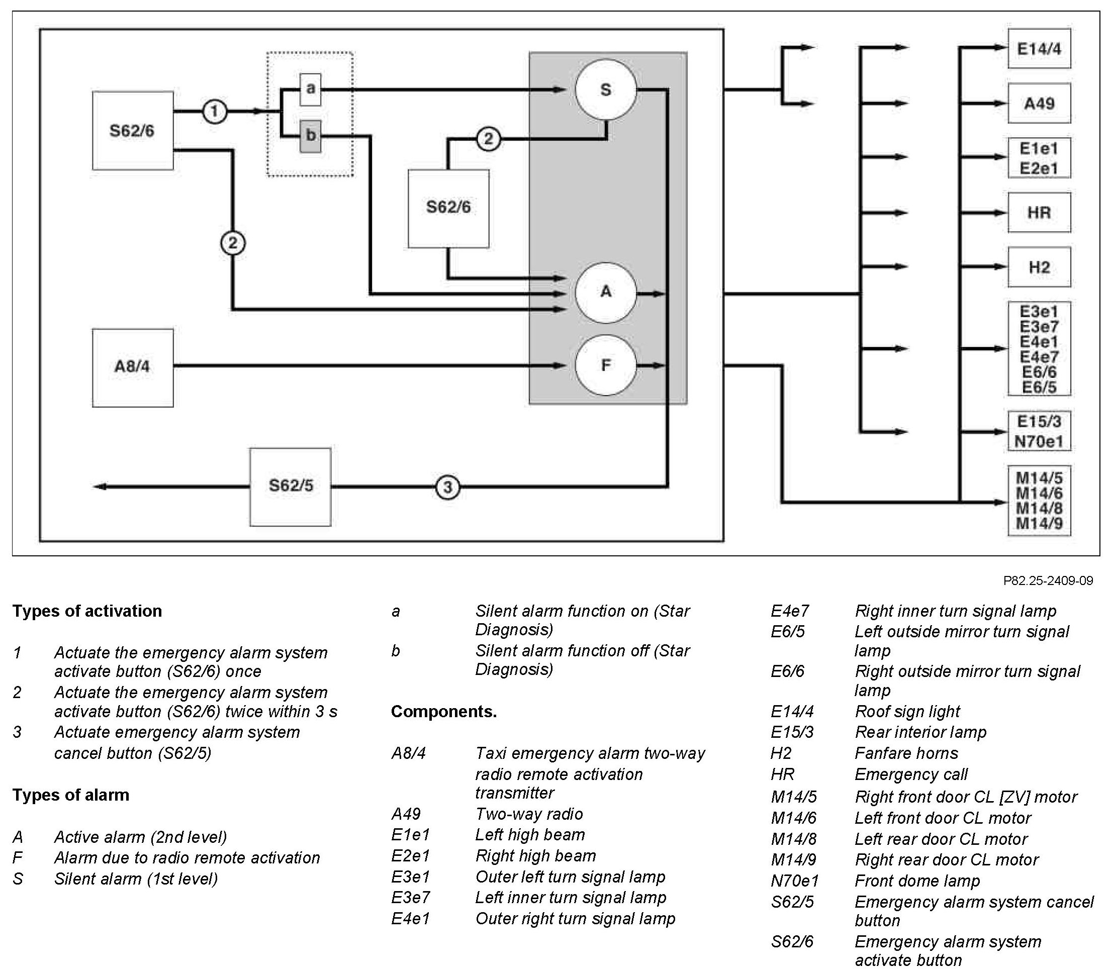 The active alarm emergency alarm is activated by pressing the system activate button (S62/6) twice (within 3 seconds) or by pressing twice (within 3 seconds) via the taxi emergency alarm two-way radio remote activation transmitter (A8/4) . The system responds with the following: