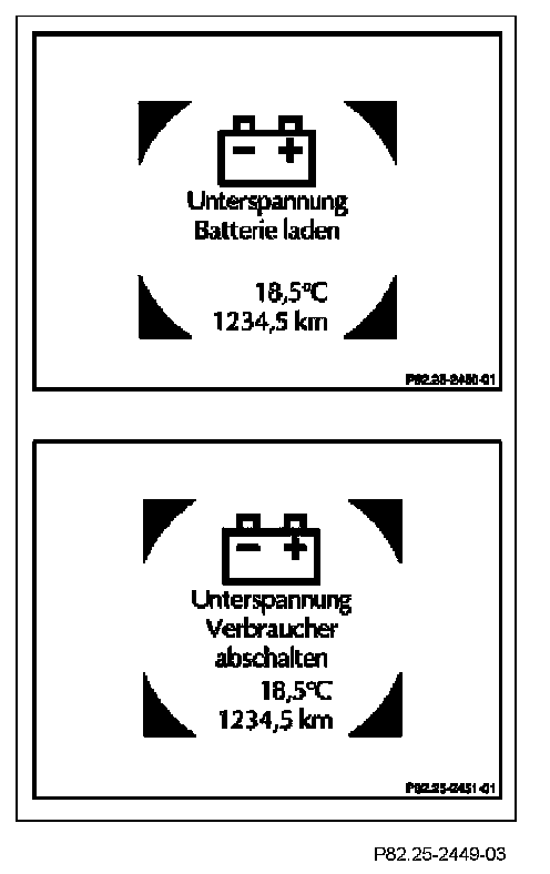 The message is indicated, if the special vehicle multifunction control unit (SVMCU [MSS]) (N26/9) detects undervoltage and the engine is not running. A chime sounds together with the activation.
