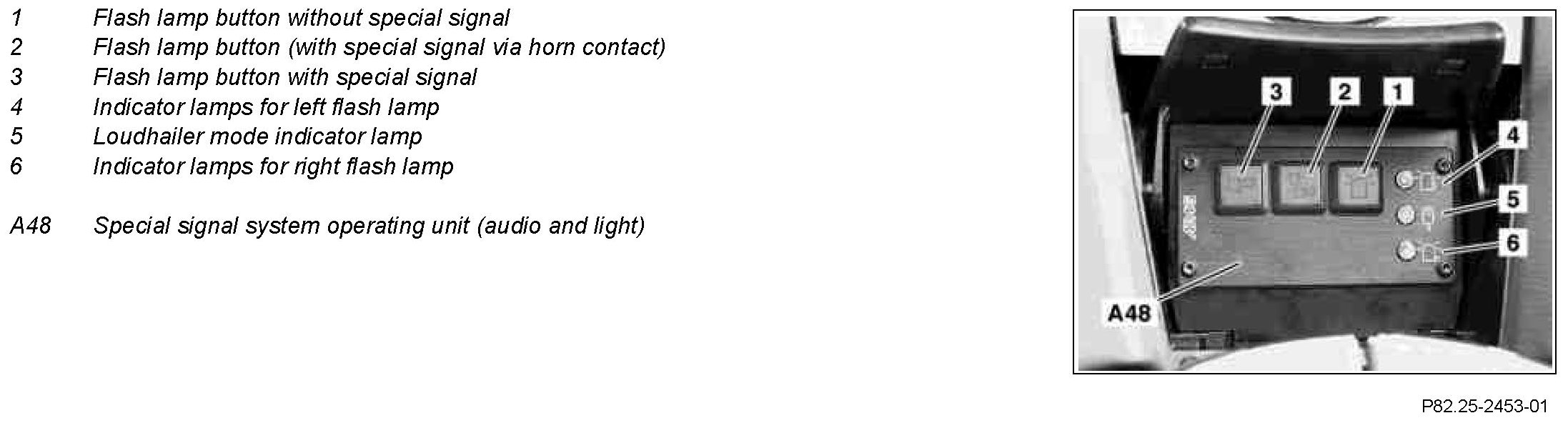 The optical and acoustic signals of the special signal system are controlled via the buttons of the special signal system operating unit (audio and light) (A48).