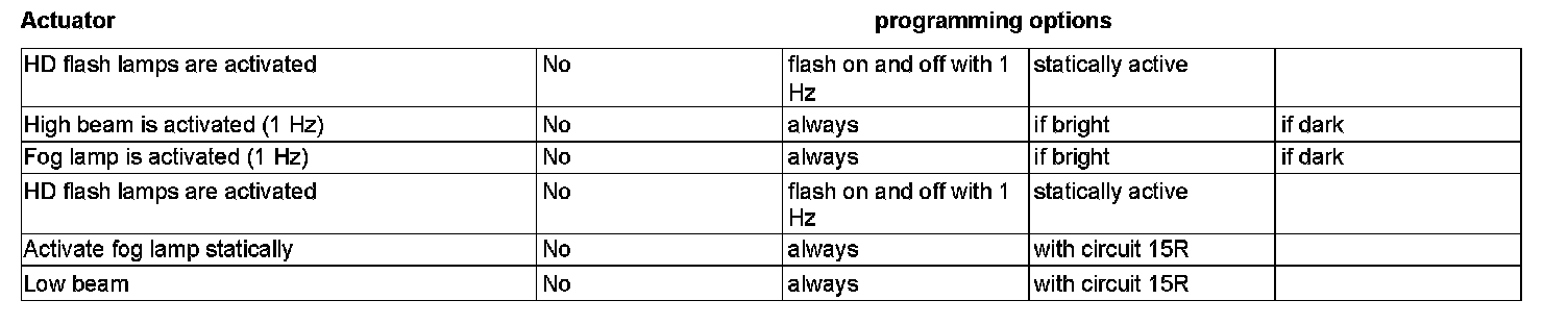 ^ If the high beams and fog lamps are activated together via the CAN interior, they will flash on and off alternately. Furthermore, in the special vehicle multifunction control unit (SVMCU [MSS]) (N26/9), it is possible to program the duration (brightness phase) during which the two light sources are to be activated while flashing on and off.