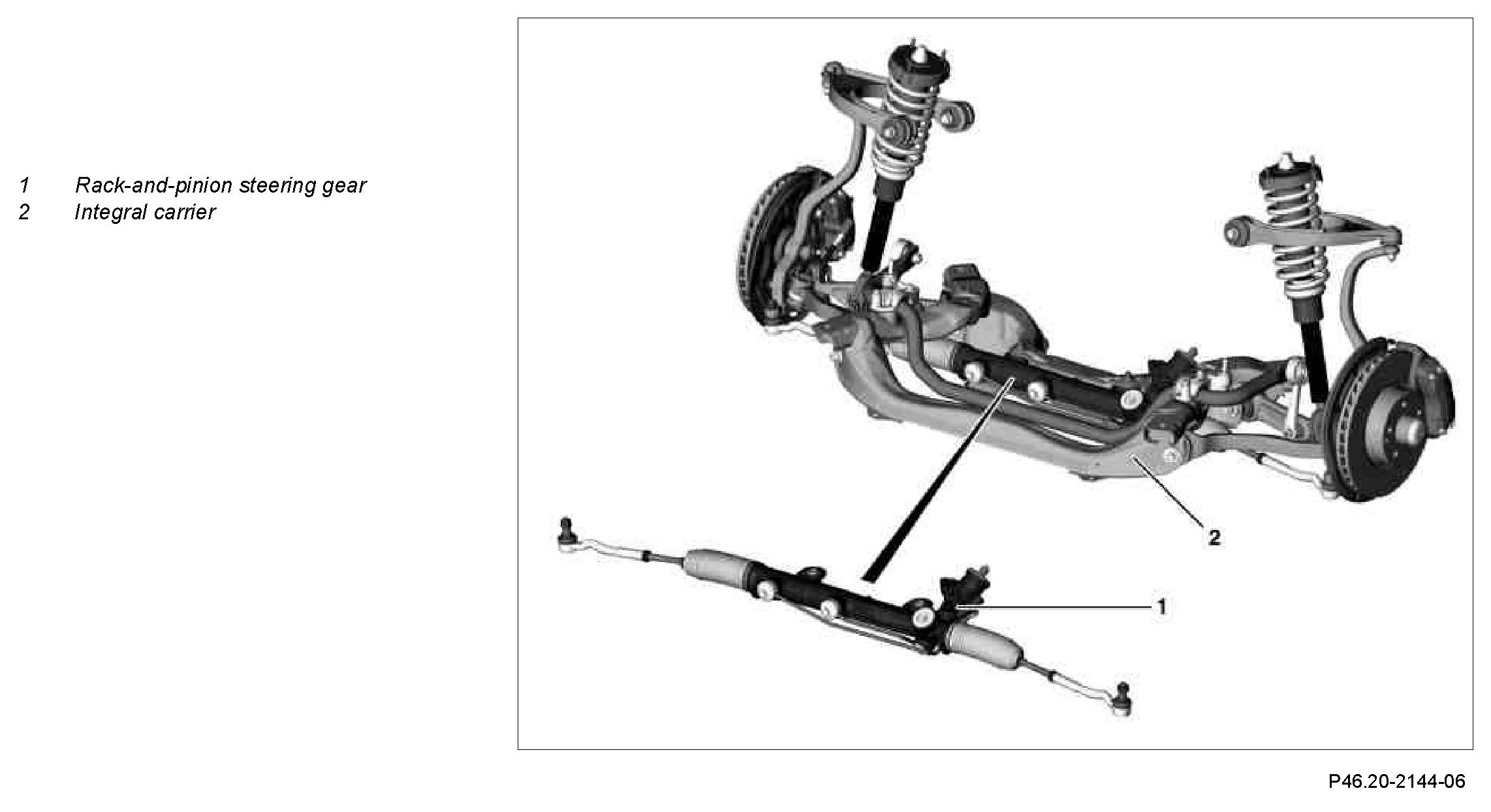 The rack-and-pinion steering gear is located in front of the wheel center in the direction of travel and is bolted onto the integral carrier via a mounting plate.