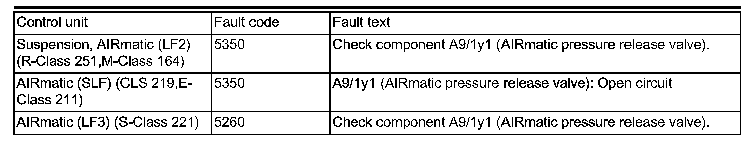 Defective connecting cables to drain valve at AIRMATIC compressor. This results in setting of the above fault codes.