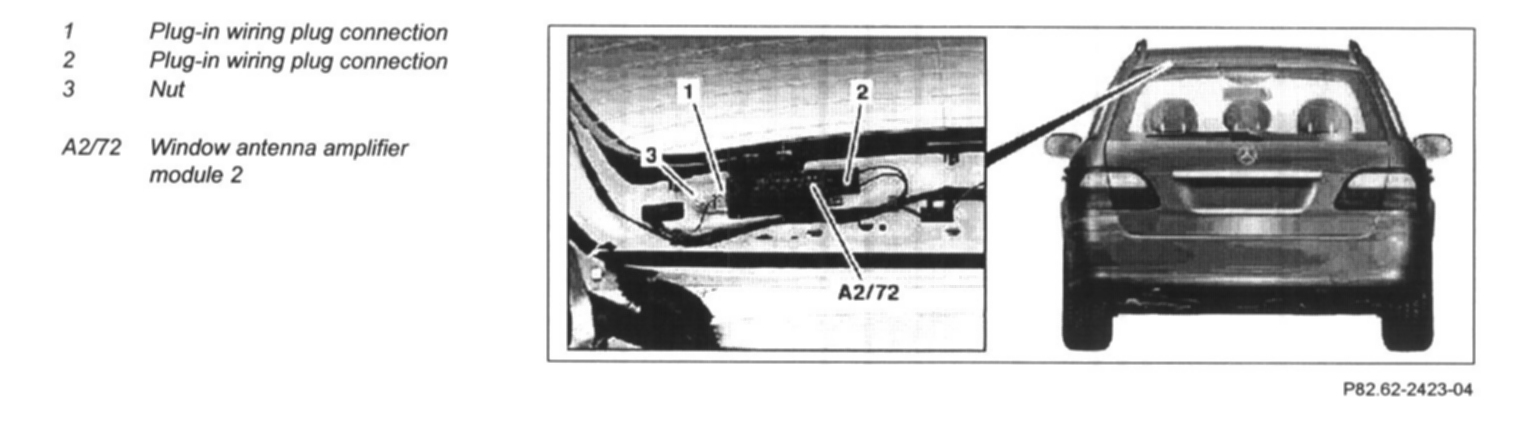 4 Unscrew nut (3) and remove amplifier module 2 windshield antenna (A2/72)