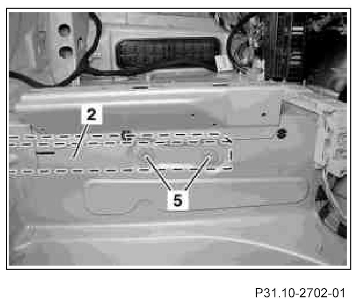 16. Tighten left longitudinal member reinforcement (2) and right longitudinal member reinforcement (3) each with two self-locking bolts M10 x 25 (5) on longitudinal member with the specified torque.