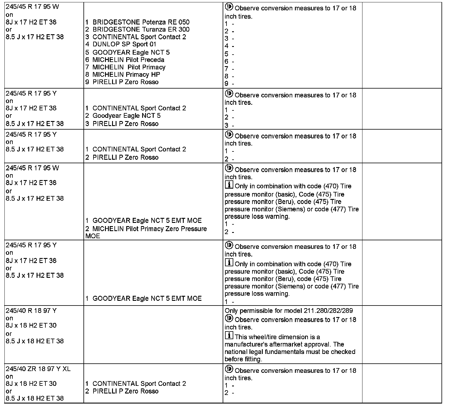 All the wheel/tire combinations listed here may only be fitted without further reason when they are listed in the registration papers under items 20 to 23 and 33 or the Technical Inspection Association experts' reports are ready.