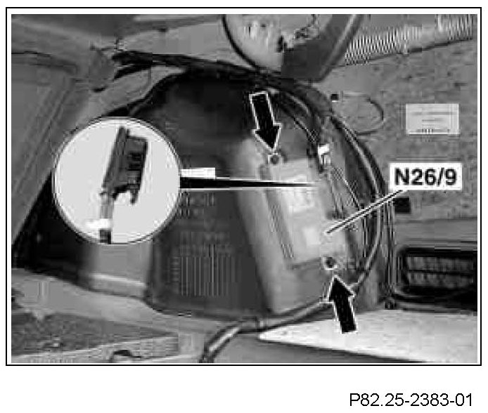 Mount special vehicle multifunction control module (MSS) (N26/9) on existing studs and secure with M6 nuts supplied (see arrows).