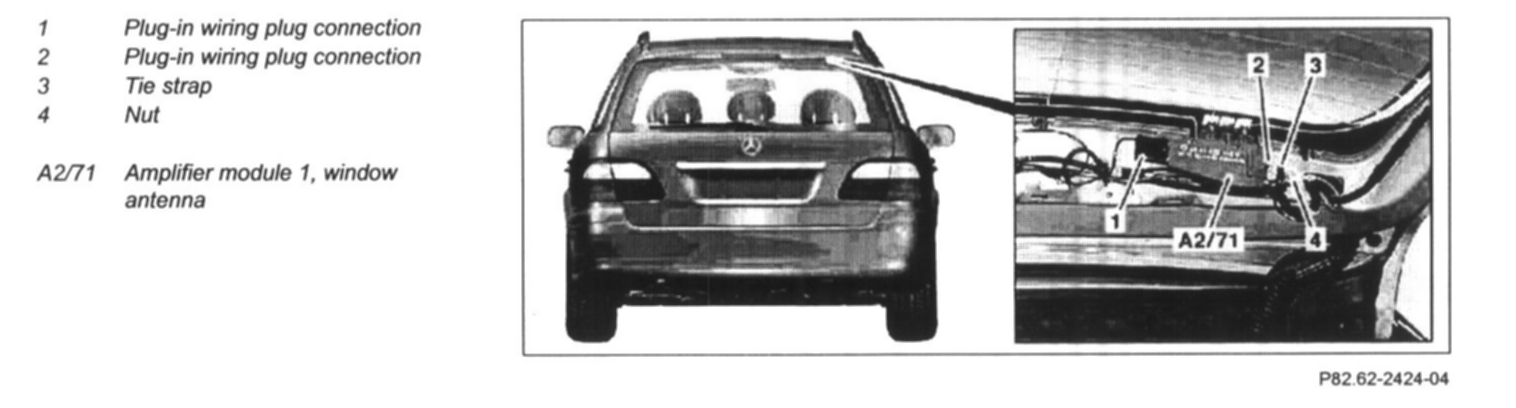 5 Unscrew nut (4) and remove amplifier module 1.windshield antenna (A2/71)