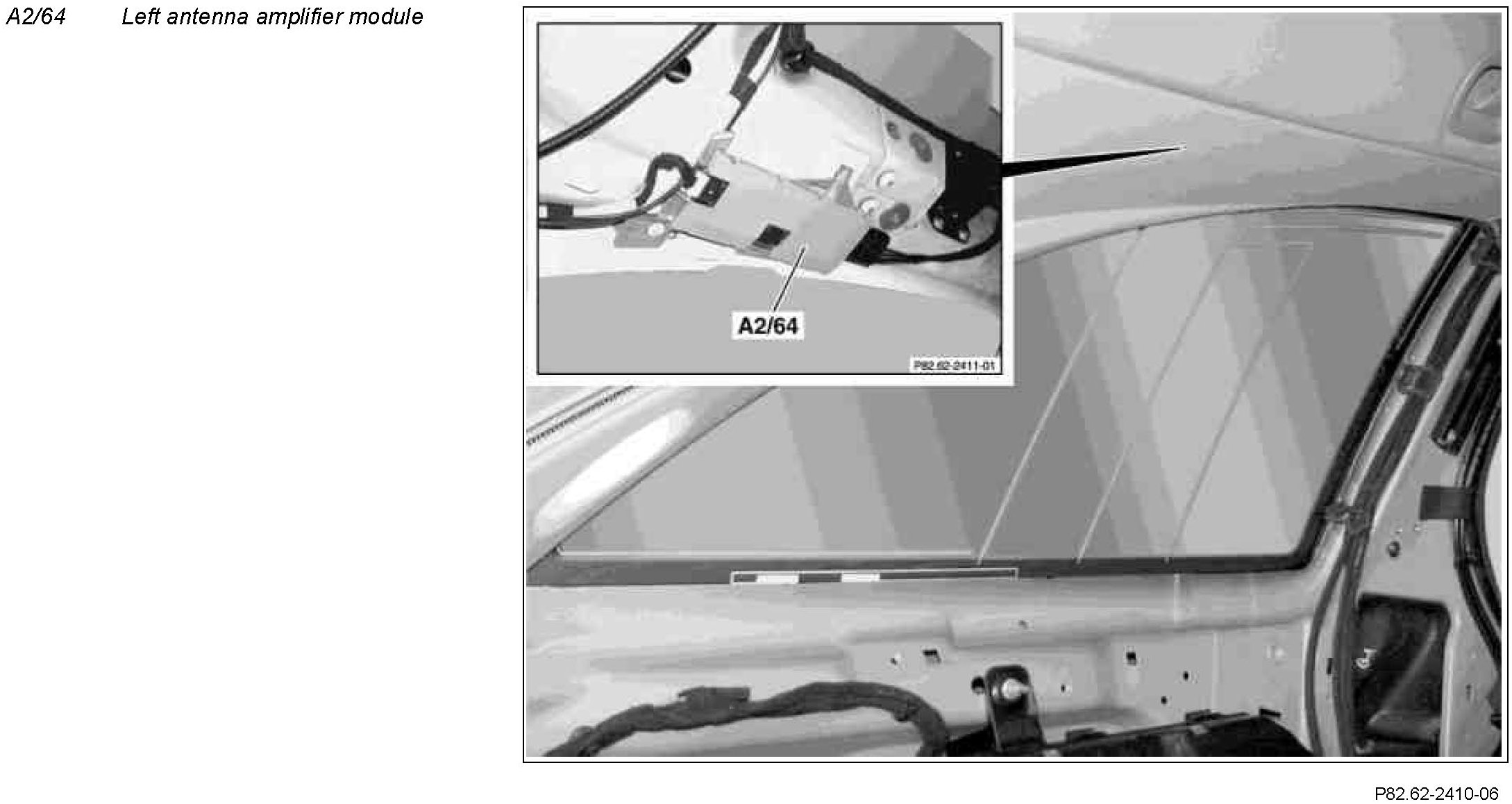 The left antenna amplifier (A2/64) is installed above the left side window and is always provided in the vehicle. It is completed i vehicles with FM diversity by the window antenna amplifier module 1 (A2/71) in the right tailgate. In addition, it is equipped with a preamplifier for the radio remote central locking.
