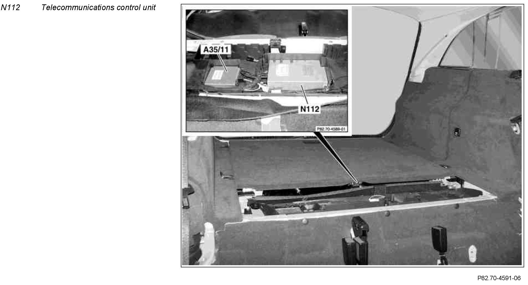 The telecommunications control unit (N112) is located on the luggage compartment floor behind the rear bench seat.
