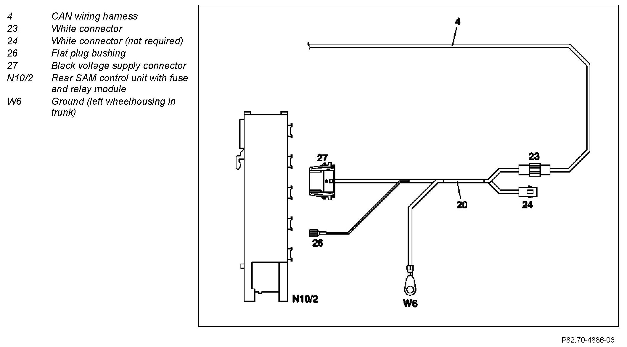 20 Connect green connector (gn) from the CAN wiring harness (4) at plug position 11 to rear SAM control unit with fuse and relay module (N10/2).