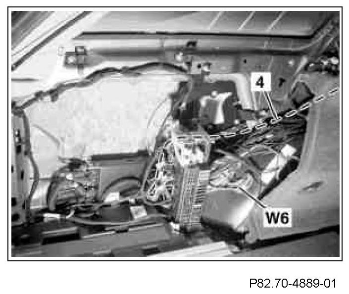 10 Route CAN wiring harness (4) along existing lines on the left of the side wall. Connect ground (left wheelhouse in trunk) (W6).