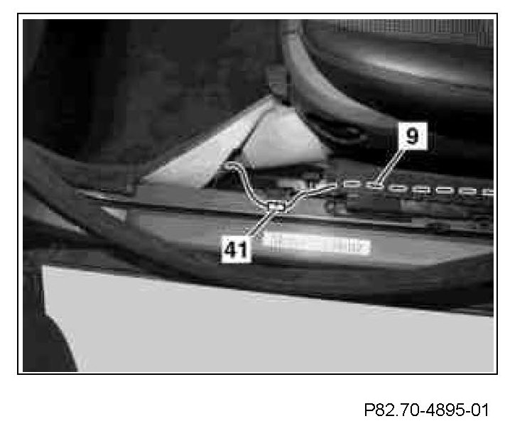 17 Uncover violet radio mute connector (41) in the area of the left door sill molding in the frame floor system and connect the radio mute extension line (9).