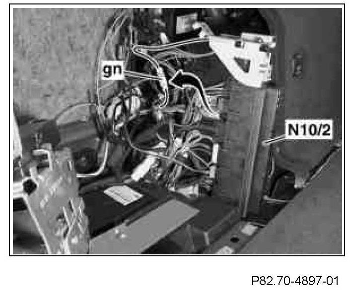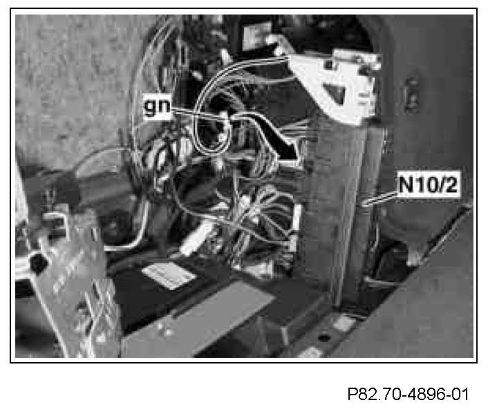 18 Unplug green (gn), 2-pin MQS plug (arrow) at the rear SAM control unit with fuse and relay module (N10/2) from plug position 11, open connector and remove lines (green casing is no longer required).