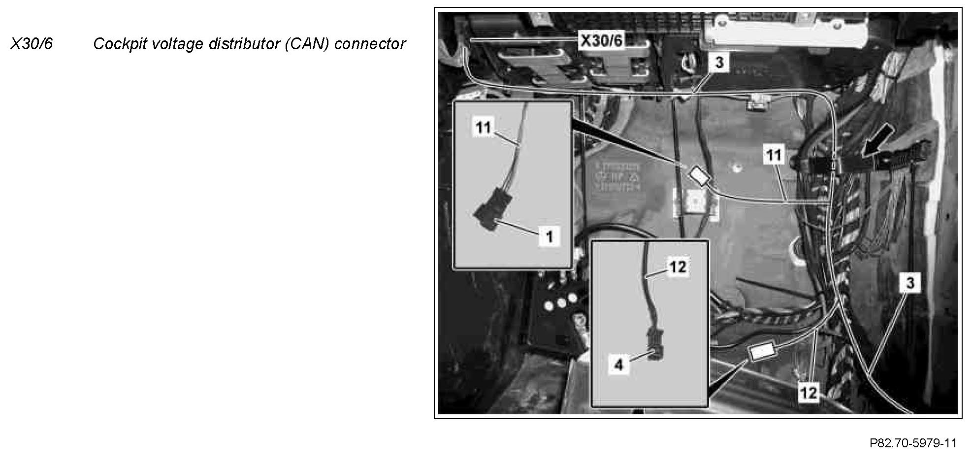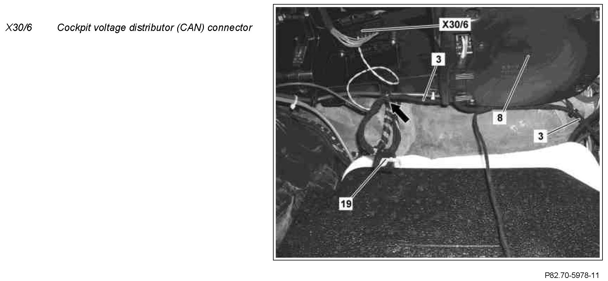 2 Remove cockpit voltage distributor (CAN) connector (X30/6) at left next to the AC housing (8) and open.