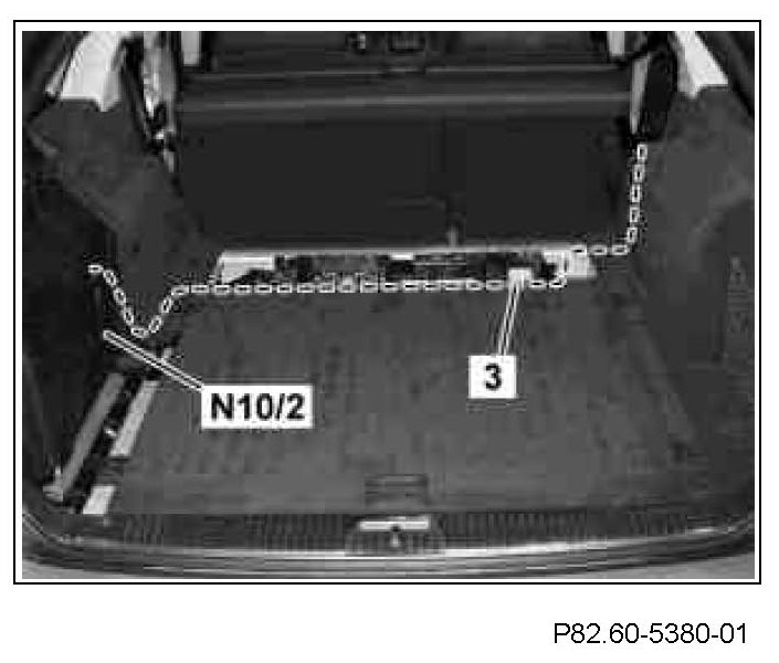 11 Route FSE 12 wiring harness (3) from right wheelhouse further into the control unit plate in the luggage compartment to the rear SAM control unit with fuse and relay module (N10/2) and fasten in place using cable ties and felt straps.