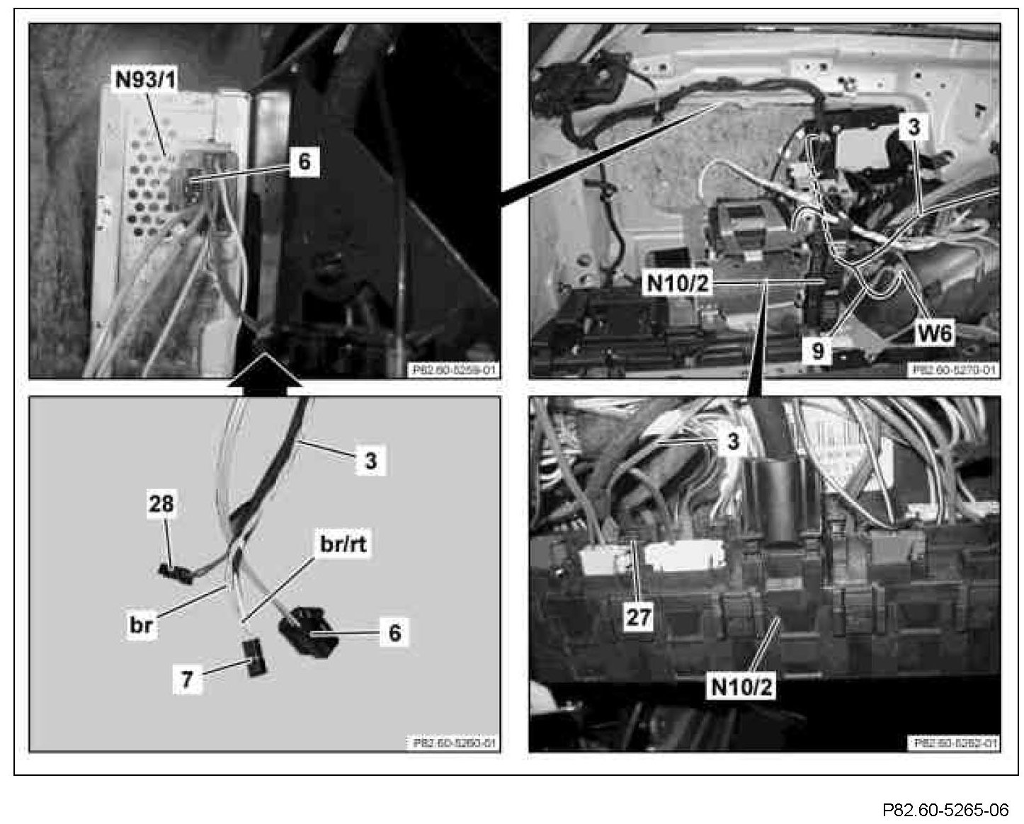 7 Insert brown (br) and brown/red (br/rt) line of vehicle's wiring harness into any contact cavity of the blue plug (28) and strap down to given wiring harness.