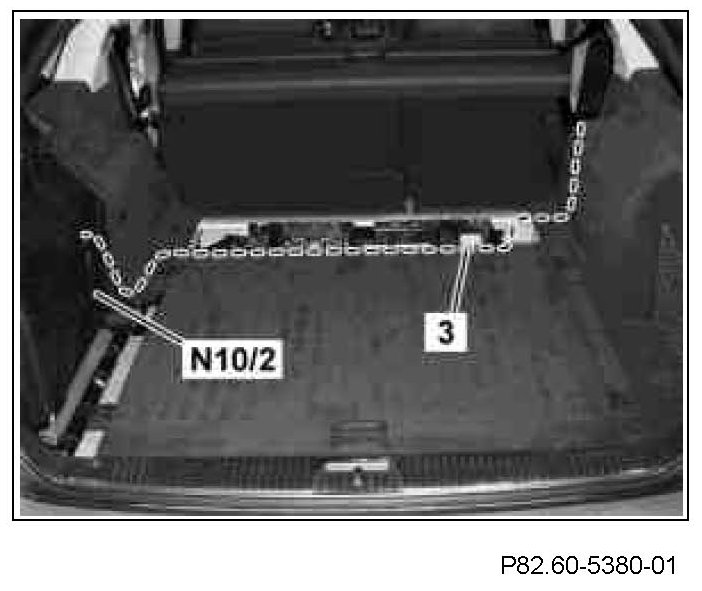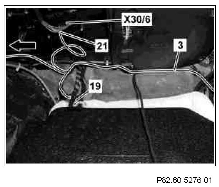 The iPod interface wiring harness (3) is routed starting at the left of the load compartment to the right front footwell. The iPod interface wiring harness (3) is to be routed under the floor covering only. It must be routed and fastened such that any damage and vibration noise is prevented.