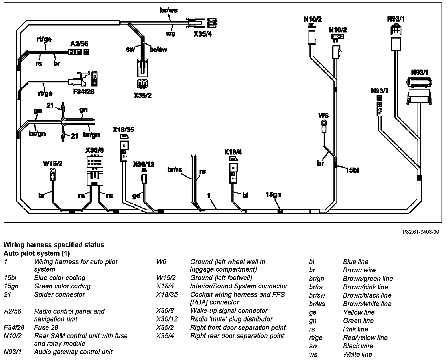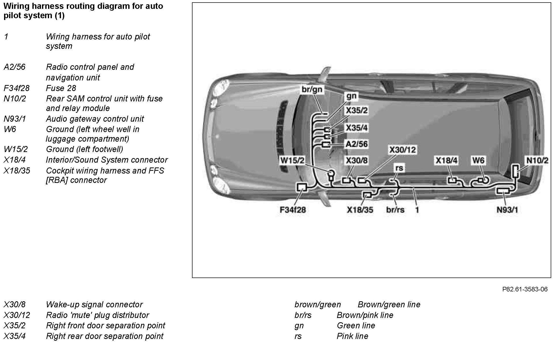 32 Route branch-off line with extended green line (gn) and the extended brown/green line (br/gn), as shown, into the radio recess.