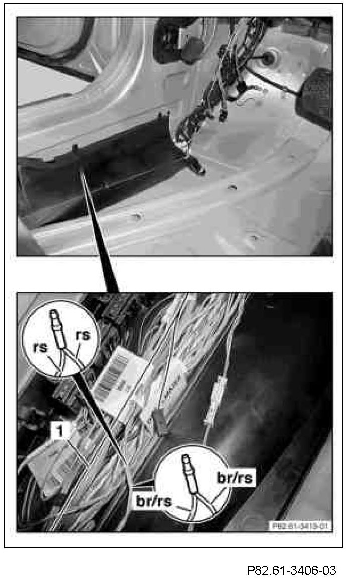 14 Use a solder connector to connect the brown/pink line (br/rs) of the standard installed wiring harness, which is routed through the B-pillar to the left rear door, with the brown/ pink line (br/rs) from the auto pilot system wiring harness (1).