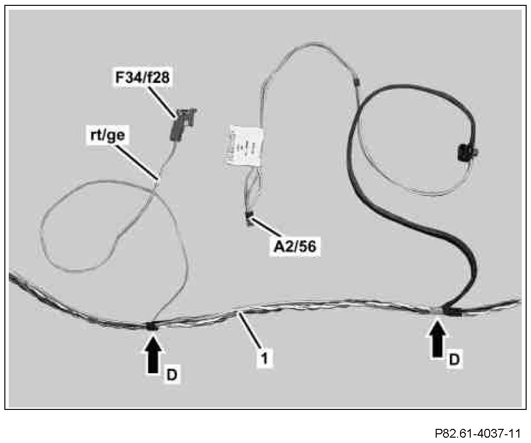 22 Branch off red/yellow line (rt/ge) with Bordeaux red fuse carrier for fuse 28 (F34f28) and branch-off line with black 4-pin coupling for radio control panel and navigation unit (A2/56) from wiring harness for auto pilot system (1) (arrows D).