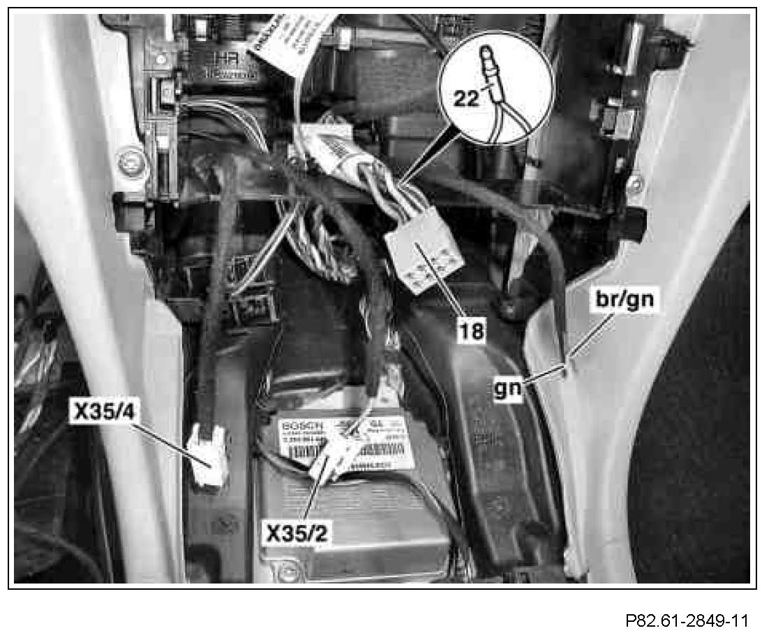 9 Expose and separate the standard white 2-pin interior/sound system connector (X18/4) with blue line (bl) in the left rear cable duct.