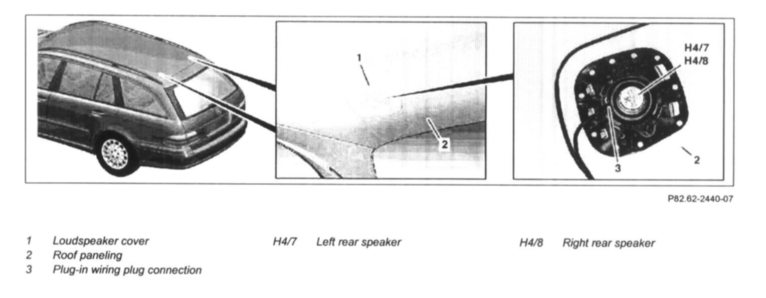 3 Undo two screws and remove the left rear speaker (H4/7) or right rear speaker (H4/8) downwards out of the headliner (2) until the electrical connector (3) is accessible