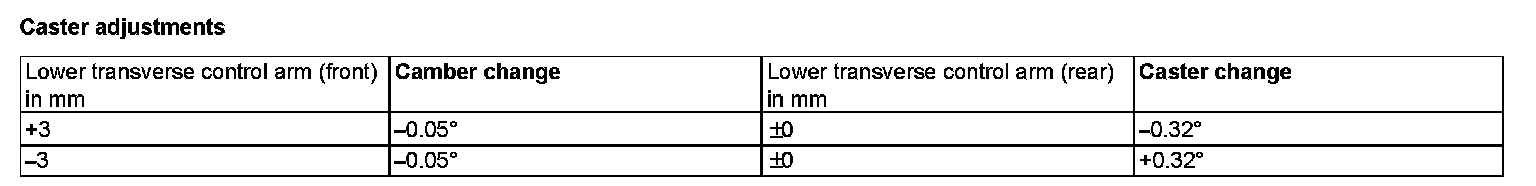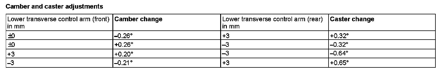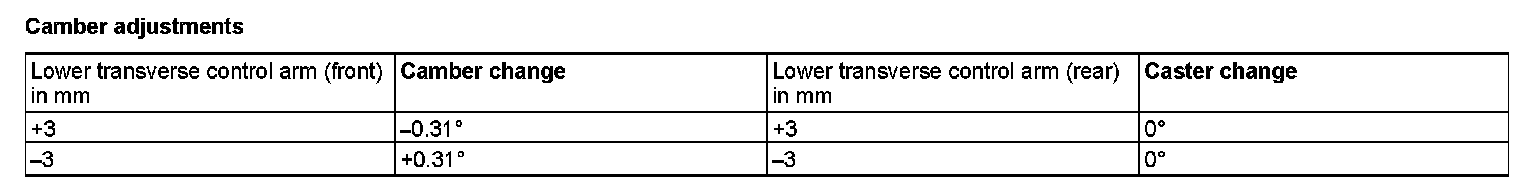 The repair bolt (19c) is centered by the adjusting washers (19d) in the elongated hole. The repair bolt (19c) can be installed on the right or left by inserting the adjusting washers (19d). As a result a range of adjustment of 3 mm inwards or outwards arises at the lower transverse control arm.