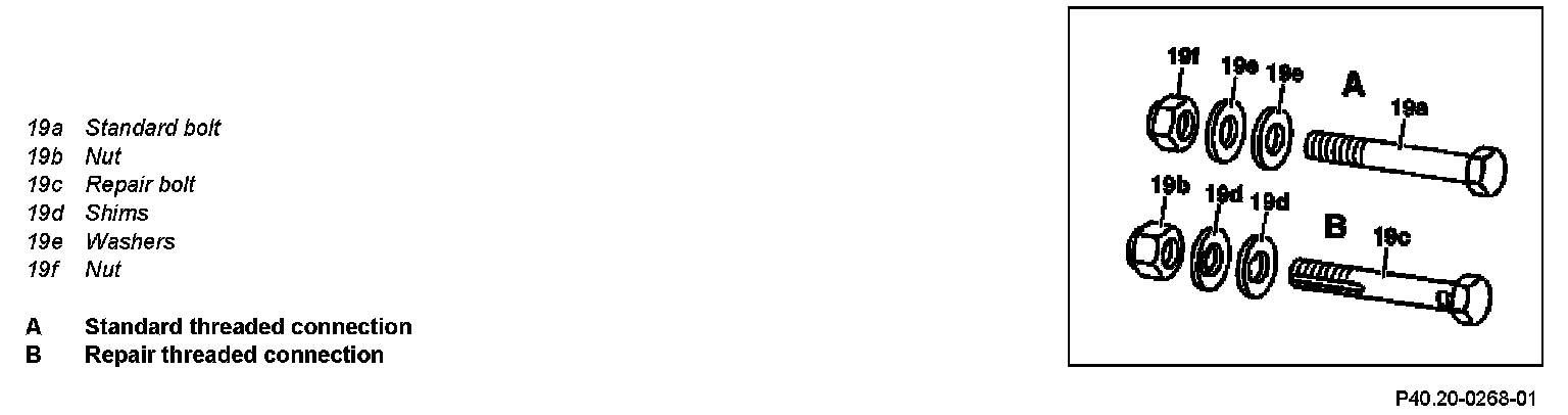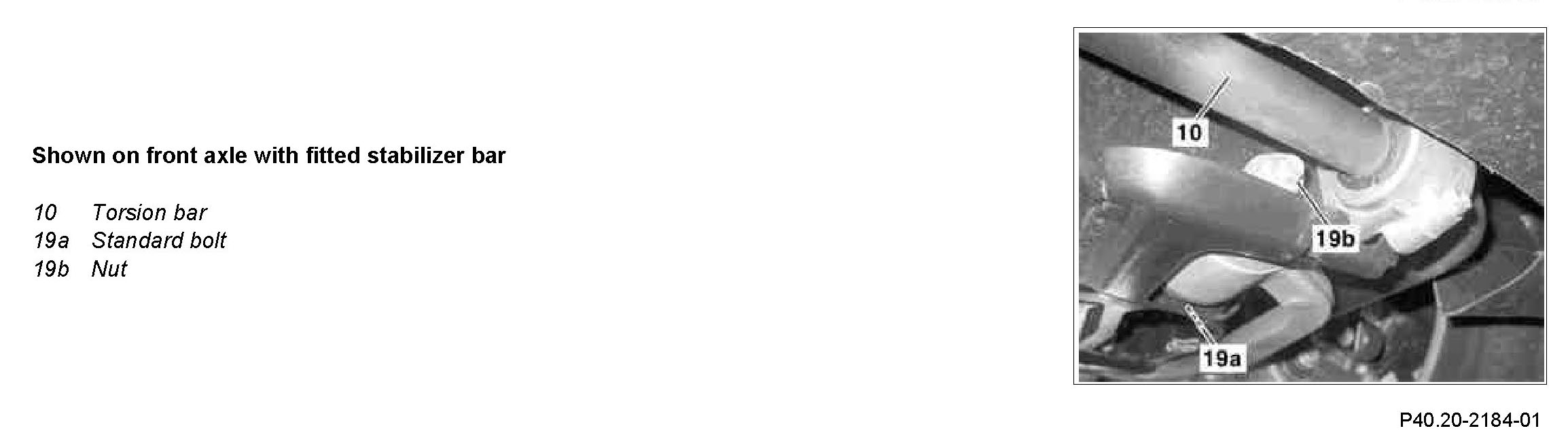 The repair bolt (19c) must not be twisted after fixing in position in the rubber mount of the lower transverse control arm. Only tighten the nuts in the ready to drive condition so that the rubber mount of the lower transverse control arm can twist when the vehicle is rocked to settle the suspension.