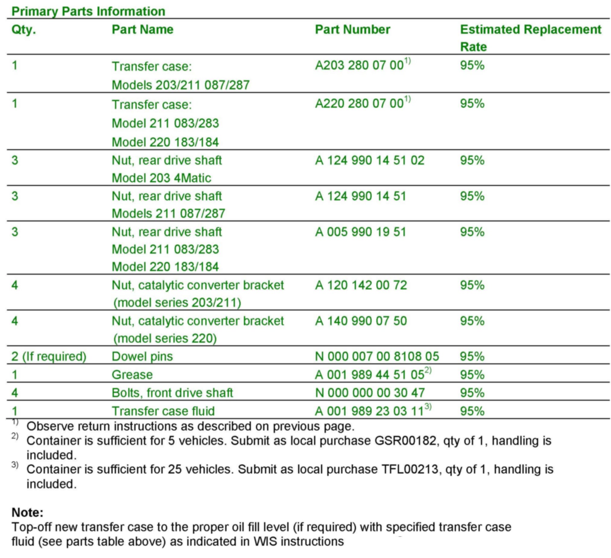 This Service Campaign has been initiated because DCAG has determined that on the affected vehicles optimized transfer cases will reduce vibrations when cornering or when parking. Dealers will check a serial number on the transfer case and replace the transfer case on affected vehicles, if required, during the next workshop visit.