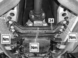 2 Detach rear engine crossmember (34).