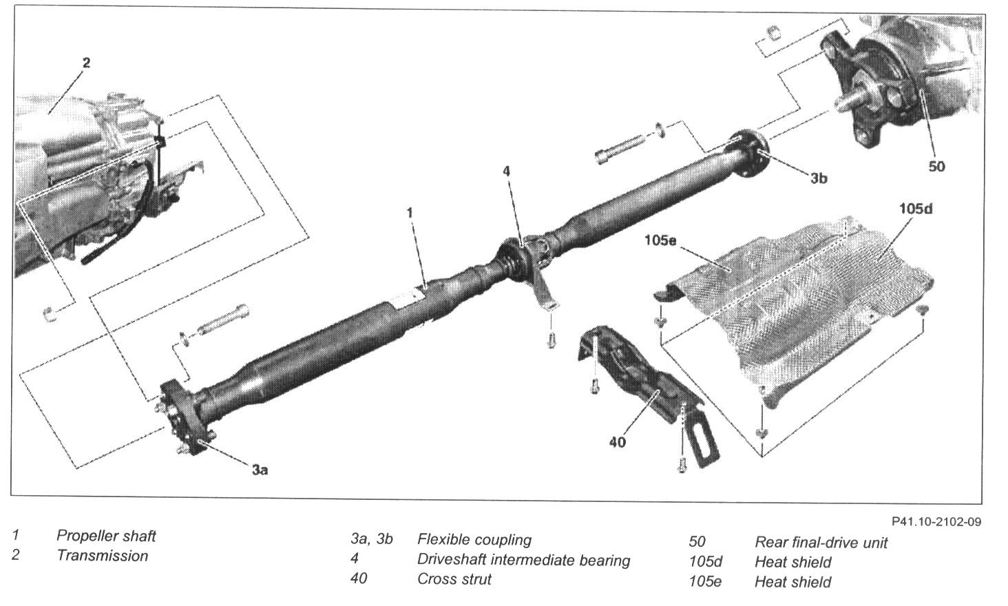 8 Detach propeller shaft (1) from centering journal from rear axle center assembly (50) and transmission (2) and remove downwards.