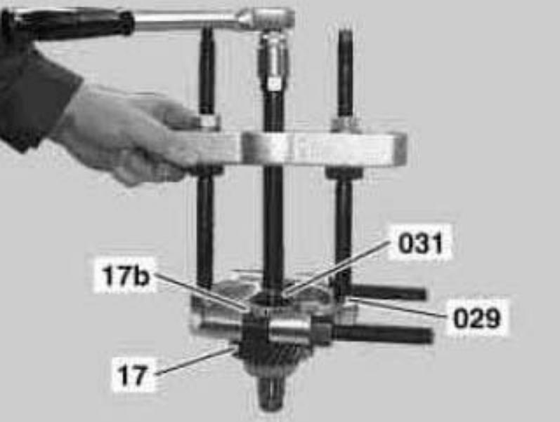 1. Pull tapered roller bearing (17b) off front axle drive output shaft (17) using puller (029). To do this, place thrust piece (031) on front axle drive output shaft (17).