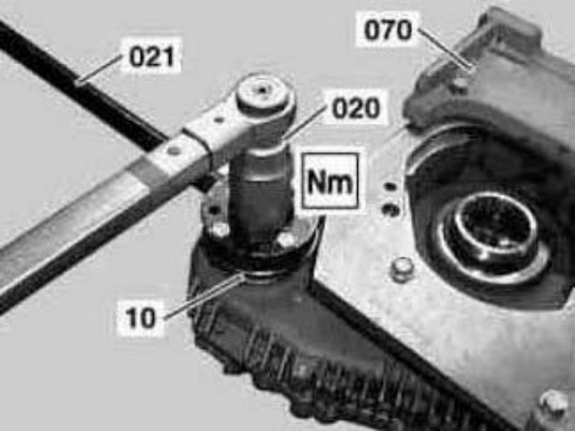 5. Screw retainer wrench (021) onto front axle output flange (10).
