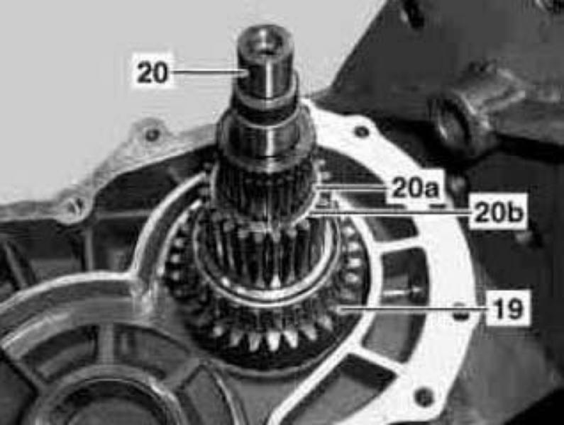 5. Remove front axle gear drive shaft (20) upwards and hollow shaft (19) downwards.