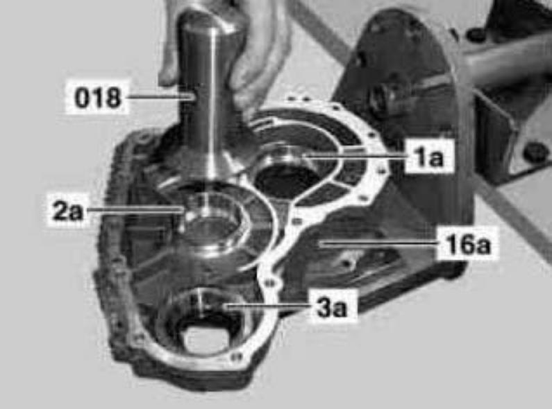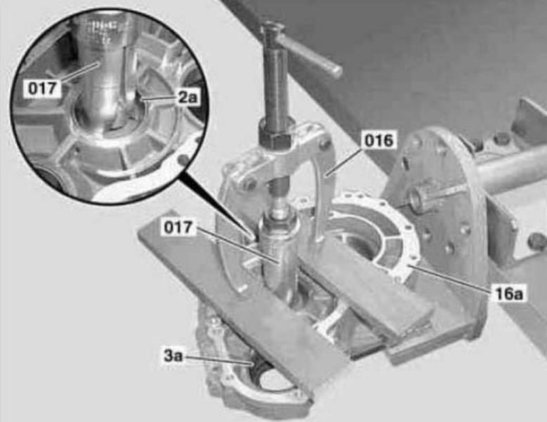 2. Pull tapered roller bearing outer race (2a) for intermediate gear and tapered roller bearing outer race (3a) for front axle drive output shaft out of front section of transmission housing (16a). To do this, use internal extractor (017) and countersupport (016).