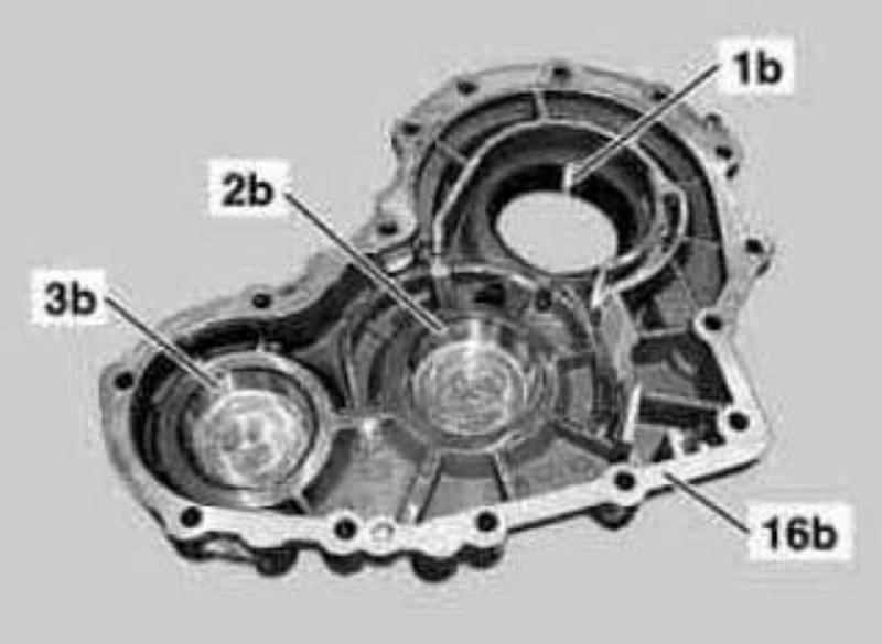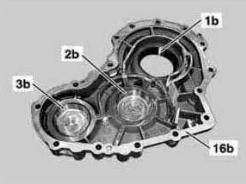4. Pull tapered roller bearing outer race (2b) for intermediate gear and tapered roller bearing outer race (3b) for front axle drive output shaft out of rear section of transmission housing (16b). To do this, use internal extractor and countersupport.