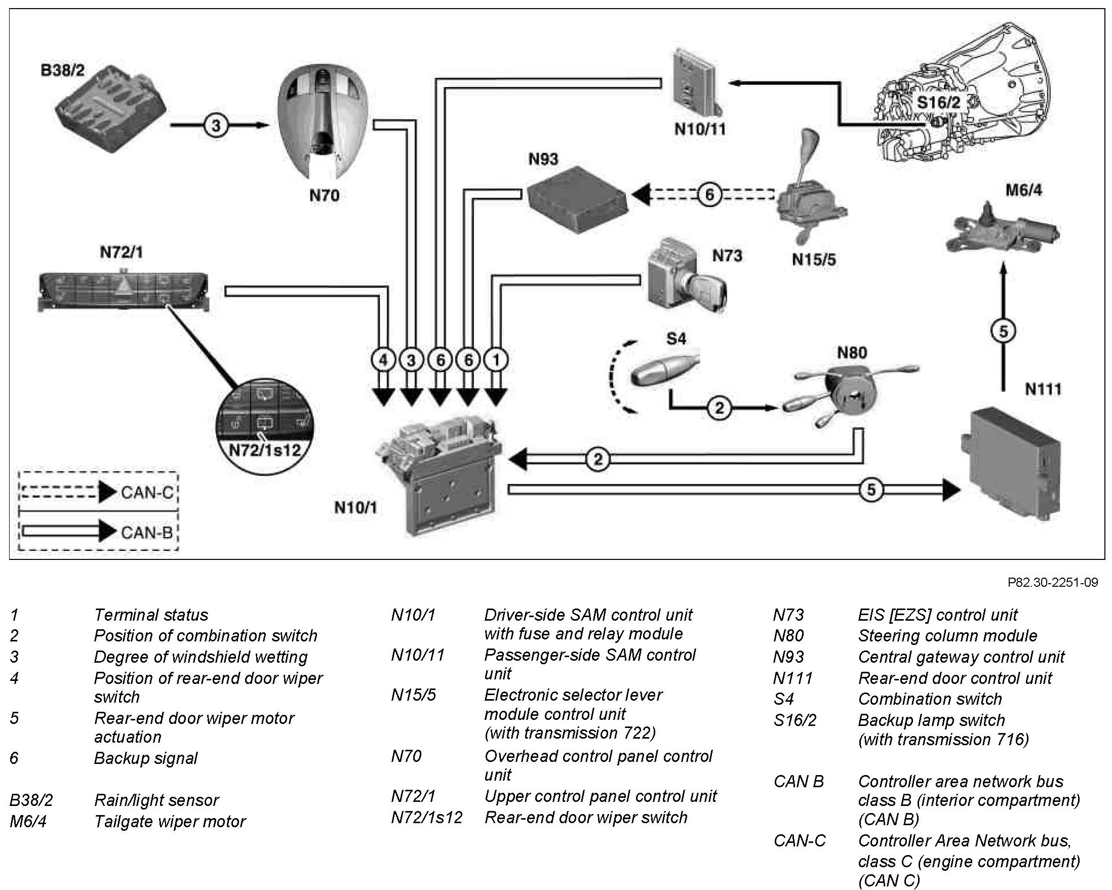 The rear window back-up wiping function is switched off either if there is no more backup signal or if the front windshield wiper is switched off.